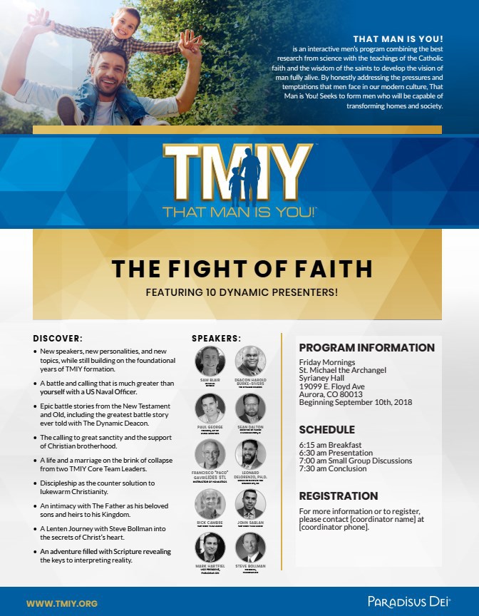 The Men’s Group meets most Saturdays during the school year from 6:00 to 8:00 AM in the Main Church. All men – married, single, widowed & divorced- from freshmen in High School and up, who are looking to build up their spiritual lives and be in fellowship with other men striving for holiness are encouraged to visit and participate. We use primarily the TMIY (That Man is You) program and some other programs from the St. Paul Institute to provide topics during faith sharing to know our faith and strengthen it. The program starts the Saturday after Labor Day and ends early May. For more information please visit the following websites: https://paradisusdei.org/ , view TMIY video https://www.youtube.com/watch?v=gza0eHz1snY&feature=youtu.be or contact the program coordinator Carl Freidhoff at cfreidhoff@comcast.net
